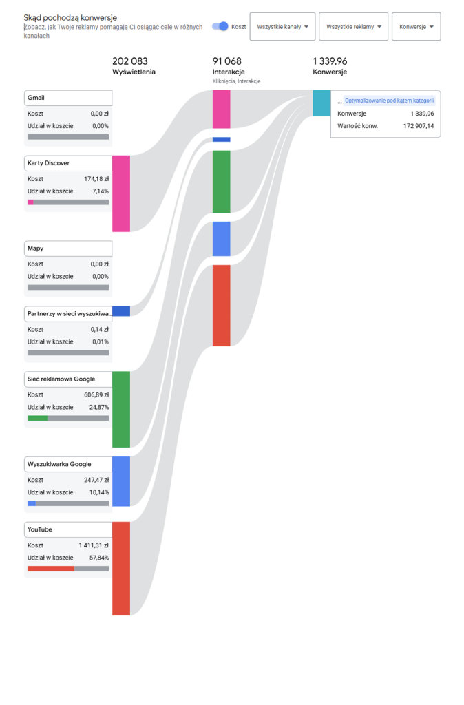 W najnowszej kampanii osiągnęliśmy imponujące wyniki, które potwierdzają pełen potencjał inteligentnych algorytmów Google. Dzięki wykorzystaniu Performance Max reklamy pojawiały się we wszystkich najważniejszych kanałach – od YouTube, przez sieć reklamową i wyszukiwarkę Google, aż po karty Discover. Efekt? Maksymalna widoczność, realne interakcje i konkretne konwersje.